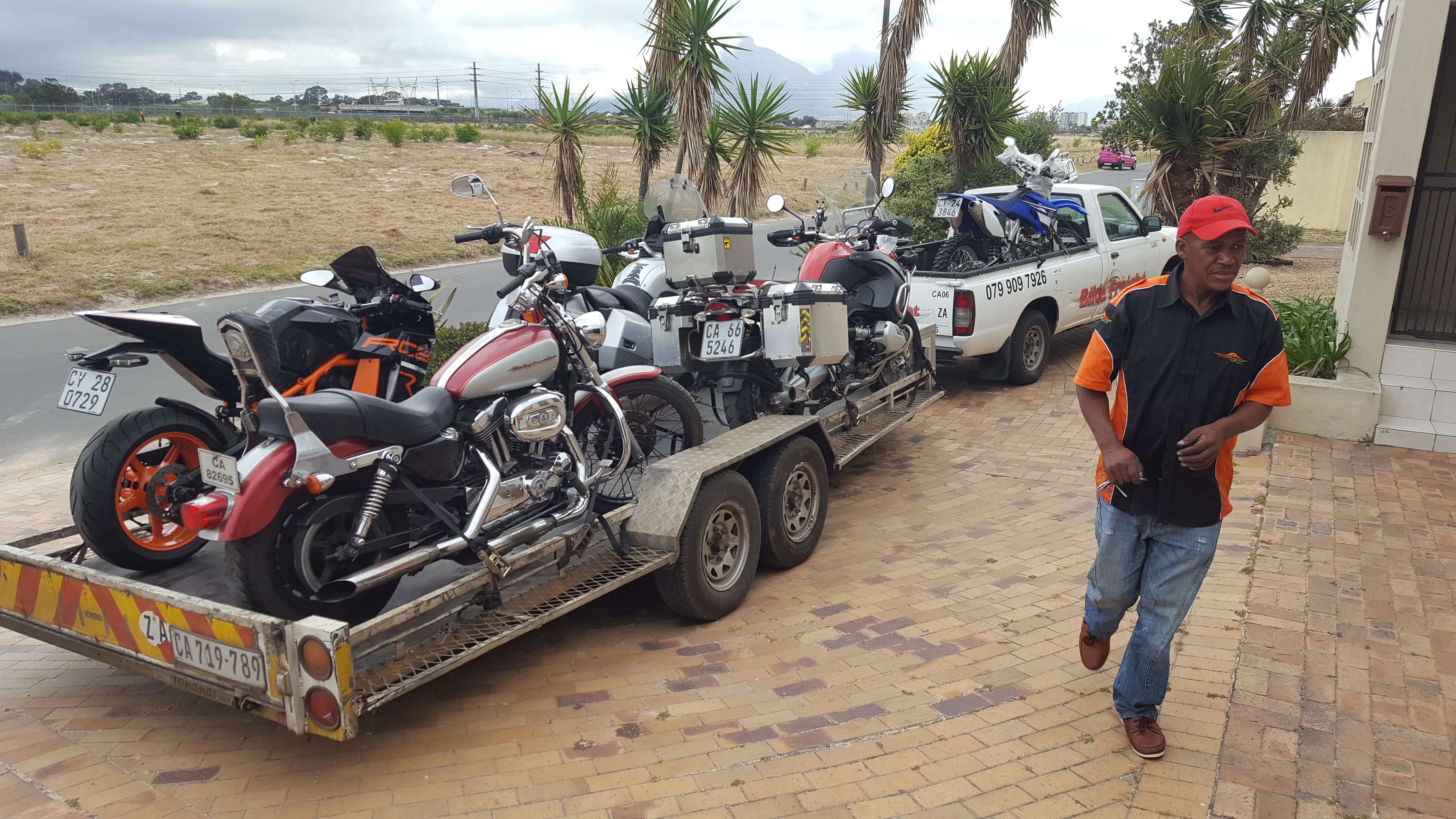 We transport all makes and types of motorcycles all over SA and Namibia door to door. Our trucks leave Cape Town around mid week depending on the load and the route. Travelling up the Garden Route to East London with stops on the way in all the major centres. Then either up to Bloemfontein or Durban then onto Johannesburg. We normally spend two days in JHB delivering and collecting stock then head back to Durban and the Garden Route back to Cape Town.