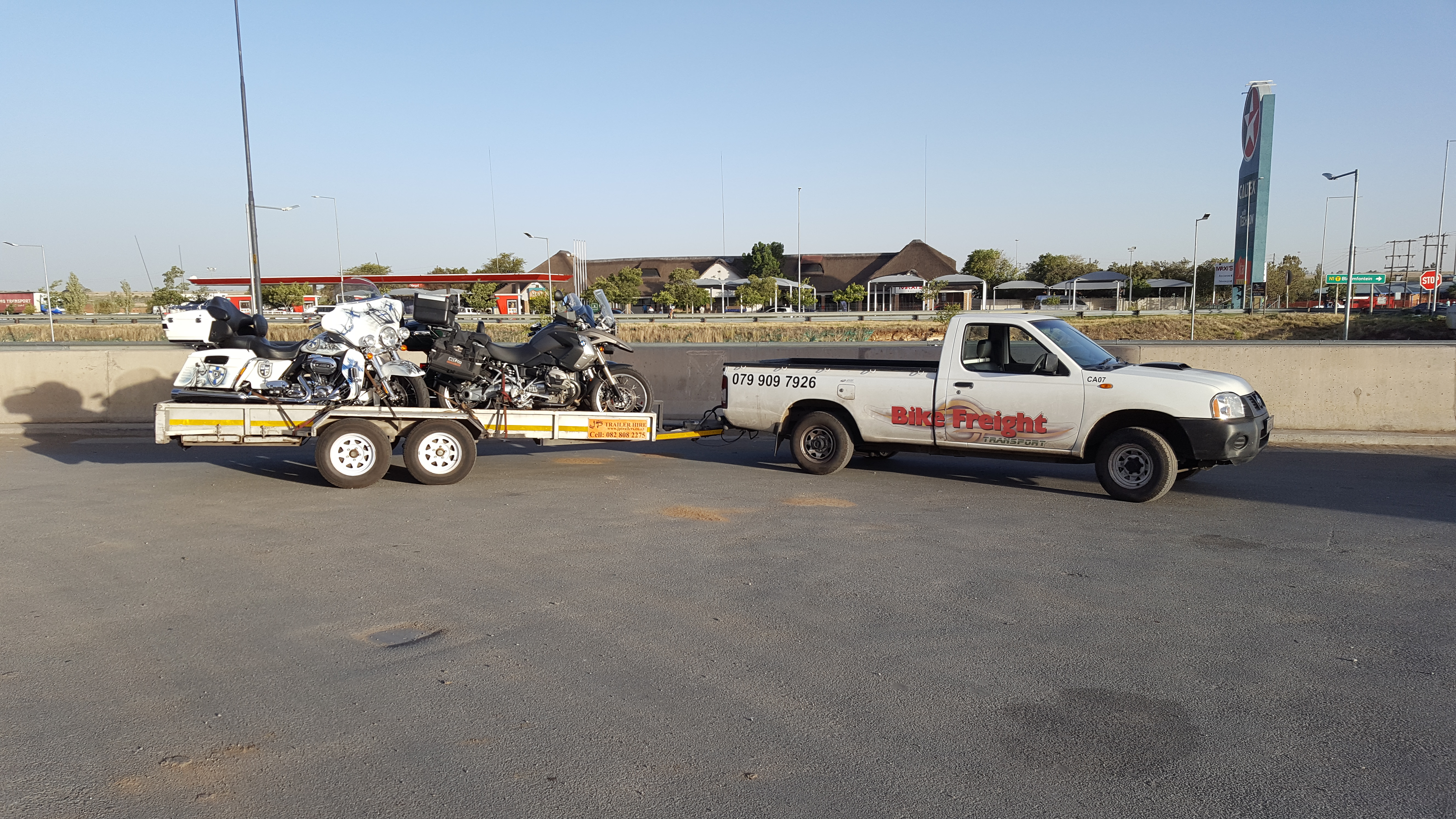 Fuel stop in Ventersburg on the way back from Jhb to Mossel Bay and Cape Town with a golf cart and BMW GS and a Harley Sportster.